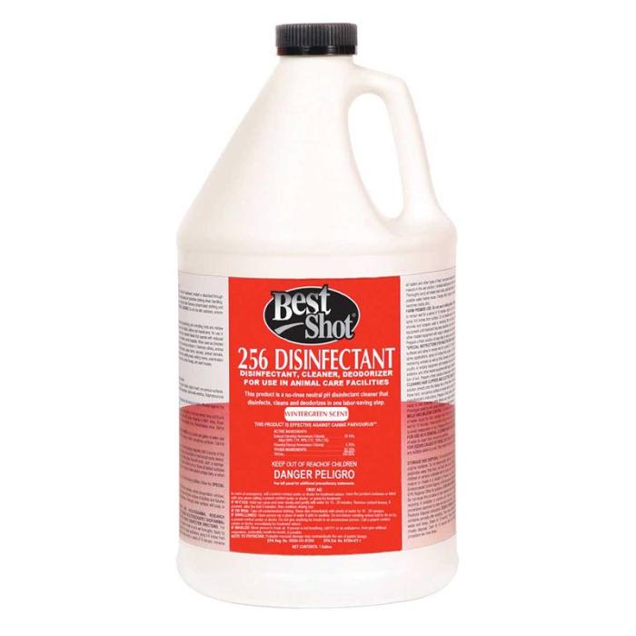 Best Shot 256 Disinfectants are the most current and effective animal care facility disinfectants, cleaners and deodorizers on the market today. Provides area control of COVID-19, Methicillin-resistant Staphylococcus aureus, staph, salmonella, E. coli, bordetella bronchiseptica, canine distemper, feline picornavirus, infectious bovine rhinotracheitis, rabies, pseudorabies, streptococcus-even canine parvovirus! Kills viruses, bacteria, fungi, mold and mildew as they clean, disinfect, and deodorize in one labor-saving step.