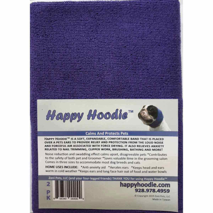 The Happy Hoodie is a soft, expandable, lightweight, safe and comfortable band that is placed over animal's ears to provide relief and protection from loud noises and forceful air. Perfect for calming and protecting pets during the force drying process. Unlike cotton balls, pets can't shake the Hoodie off and usually don't try to remove it. Happy Hoodie can also help pets who are frightened by noises in the home or who have long ears that are constantly in their food and water bowl. Package comes with 1 Small and 1 Large