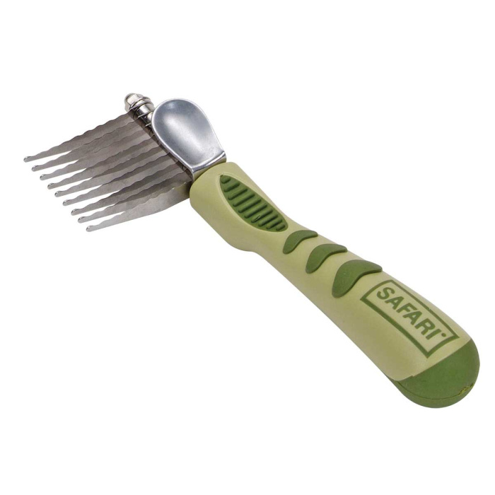 Safari de-matting combs and shedding baldes feature stainless steel blades and comfortable handles.